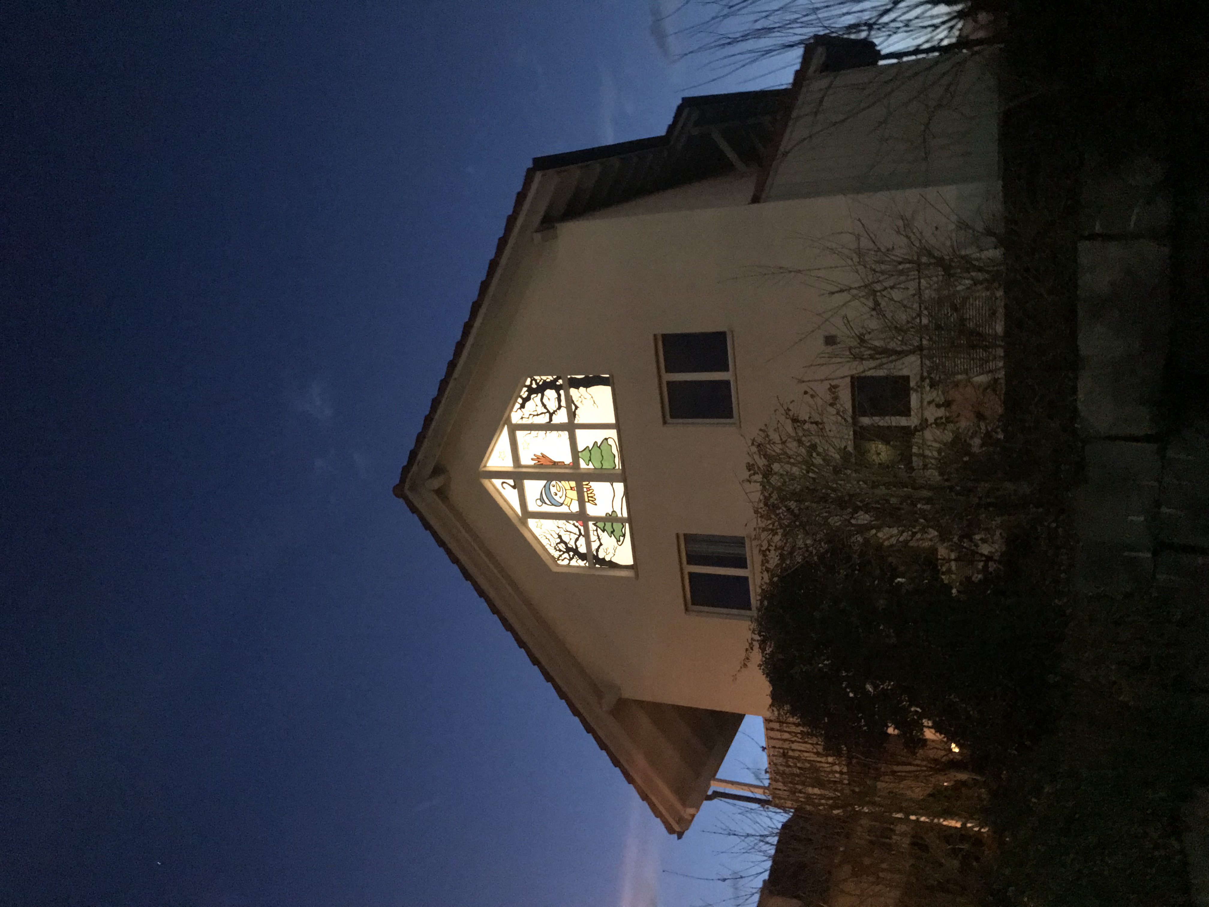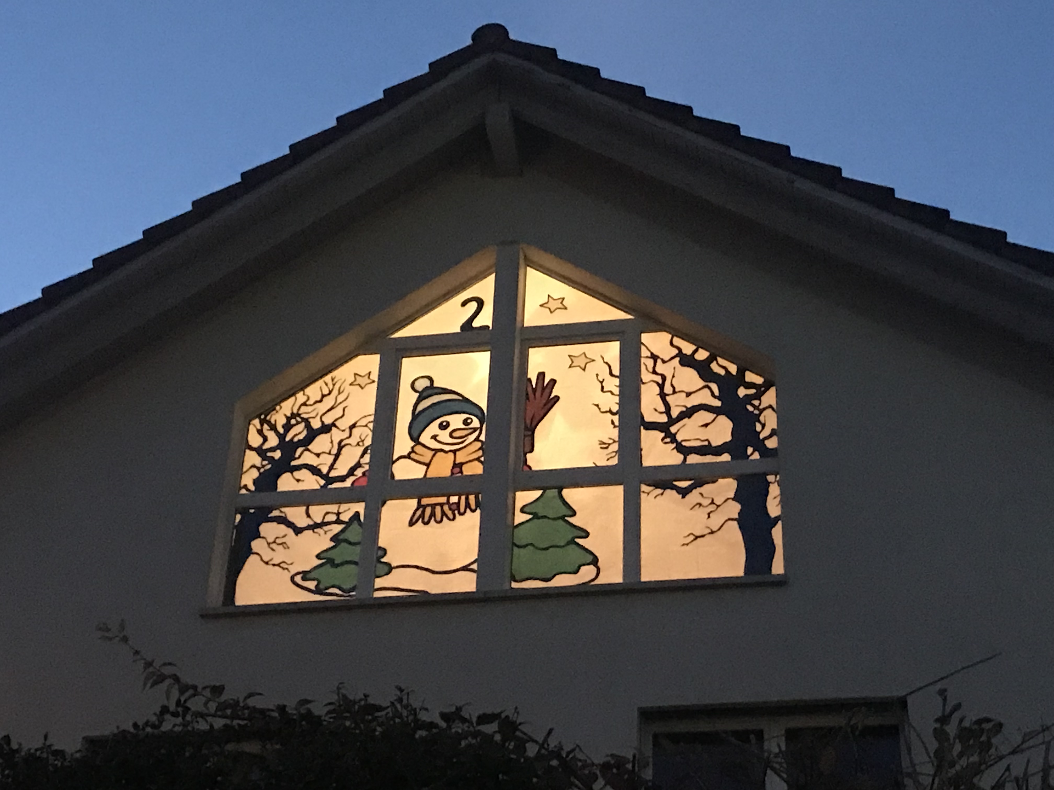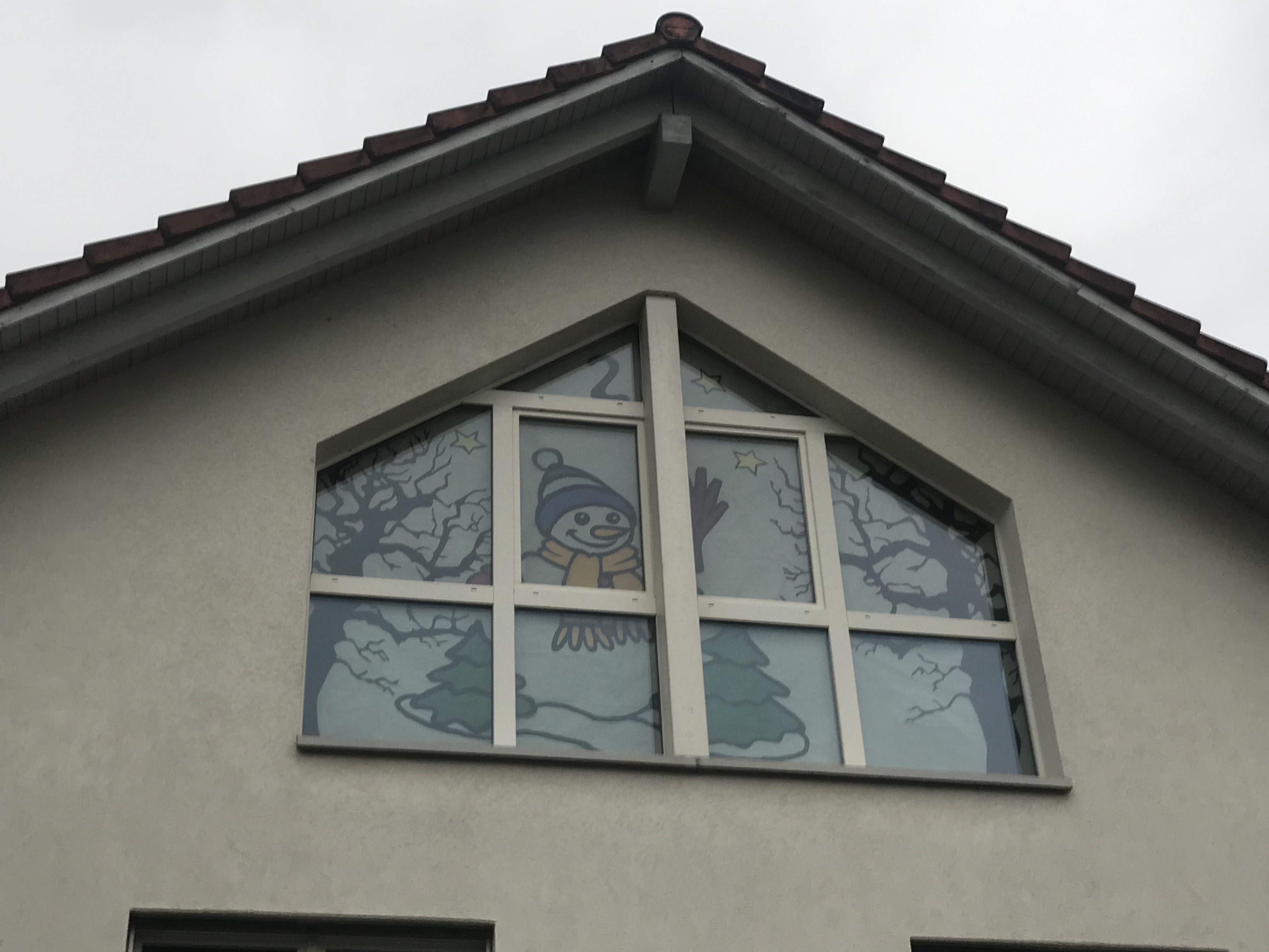 Dieses fröhliche Fensterbild zeigt einen Schneemann mit Schal und Mütze, eingerahmt von verschneiten Tannen und kahlen Winterbäumen. Sterne funkeln am Himmel und verleihen der Szene eine heitere, winterliche Stimmung. Ein liebevoll gestaltetes Motiv, das Wärme und Freude in die Adventszeit bringt.